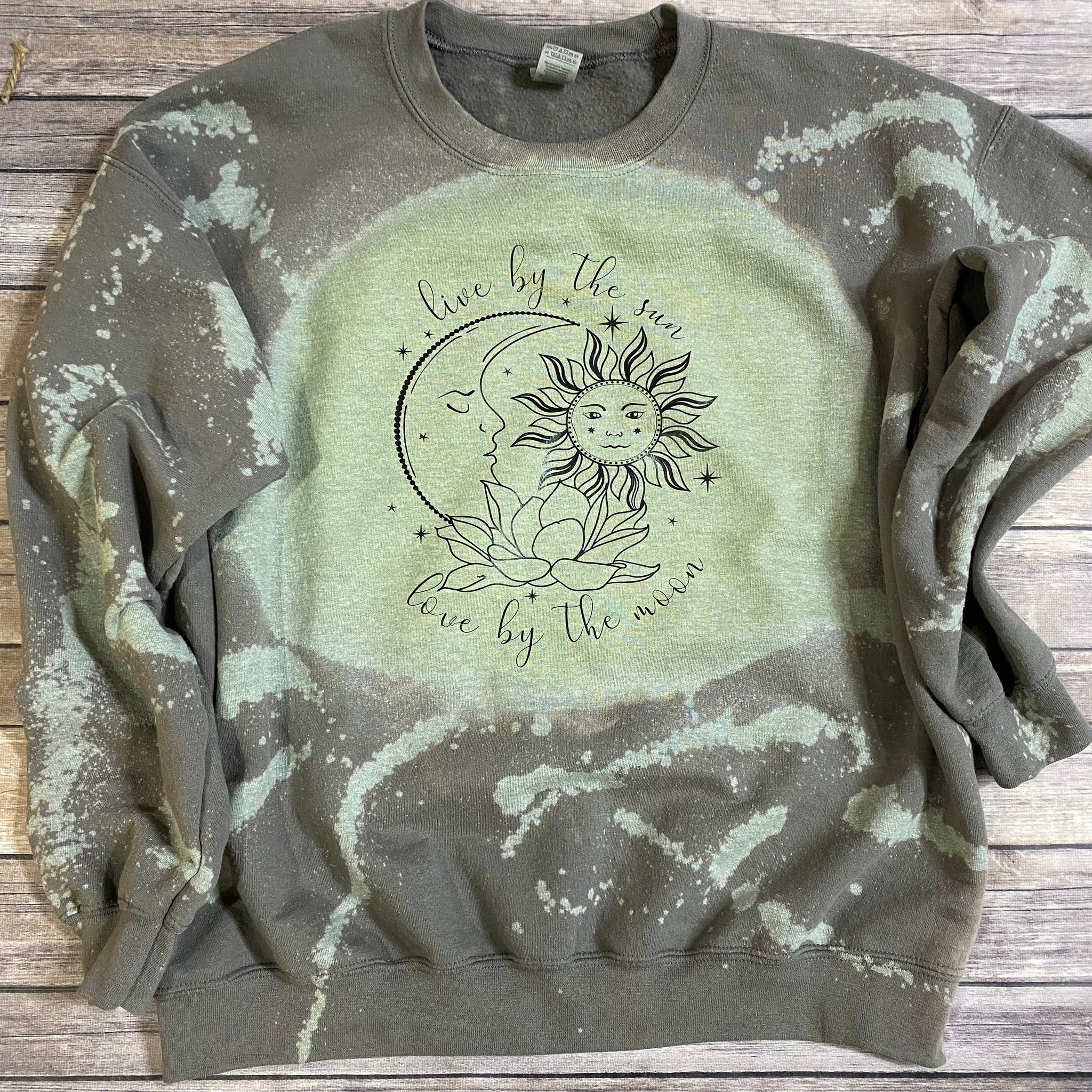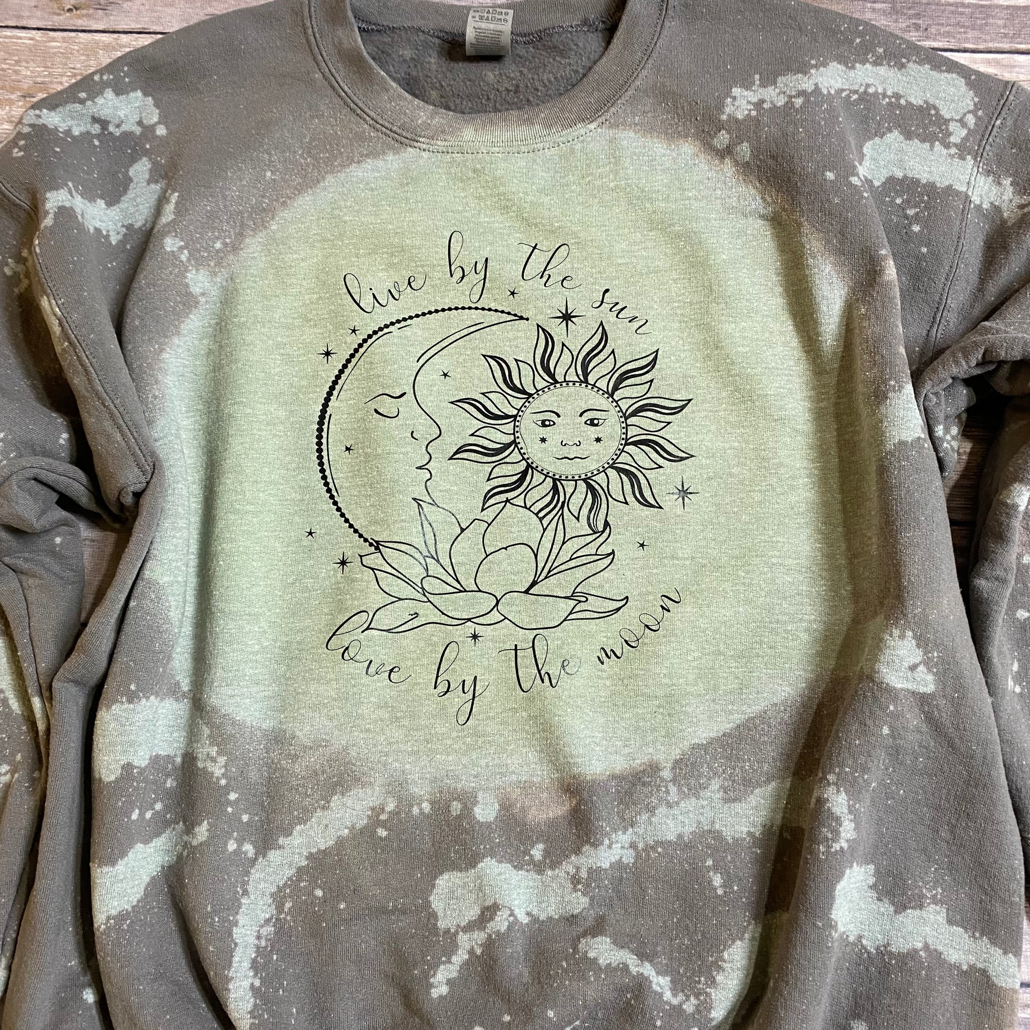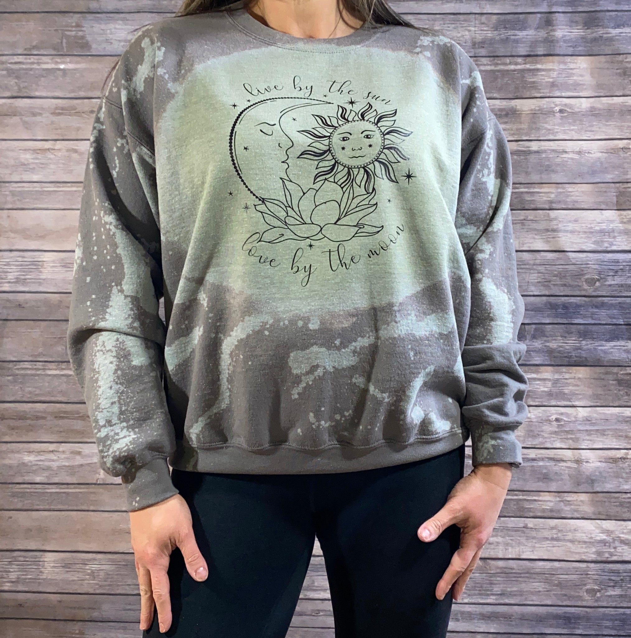 Live by the Sun and Love by the Moon! A lovely saying added to a gorgeous design with a moon, a sun, and a lotus flower. The sweatshirt itself starts as charcoal and then bleaches to a softer grey. These sweatshirts are SUPER soft on the inside. They are unisex and they run true to size.