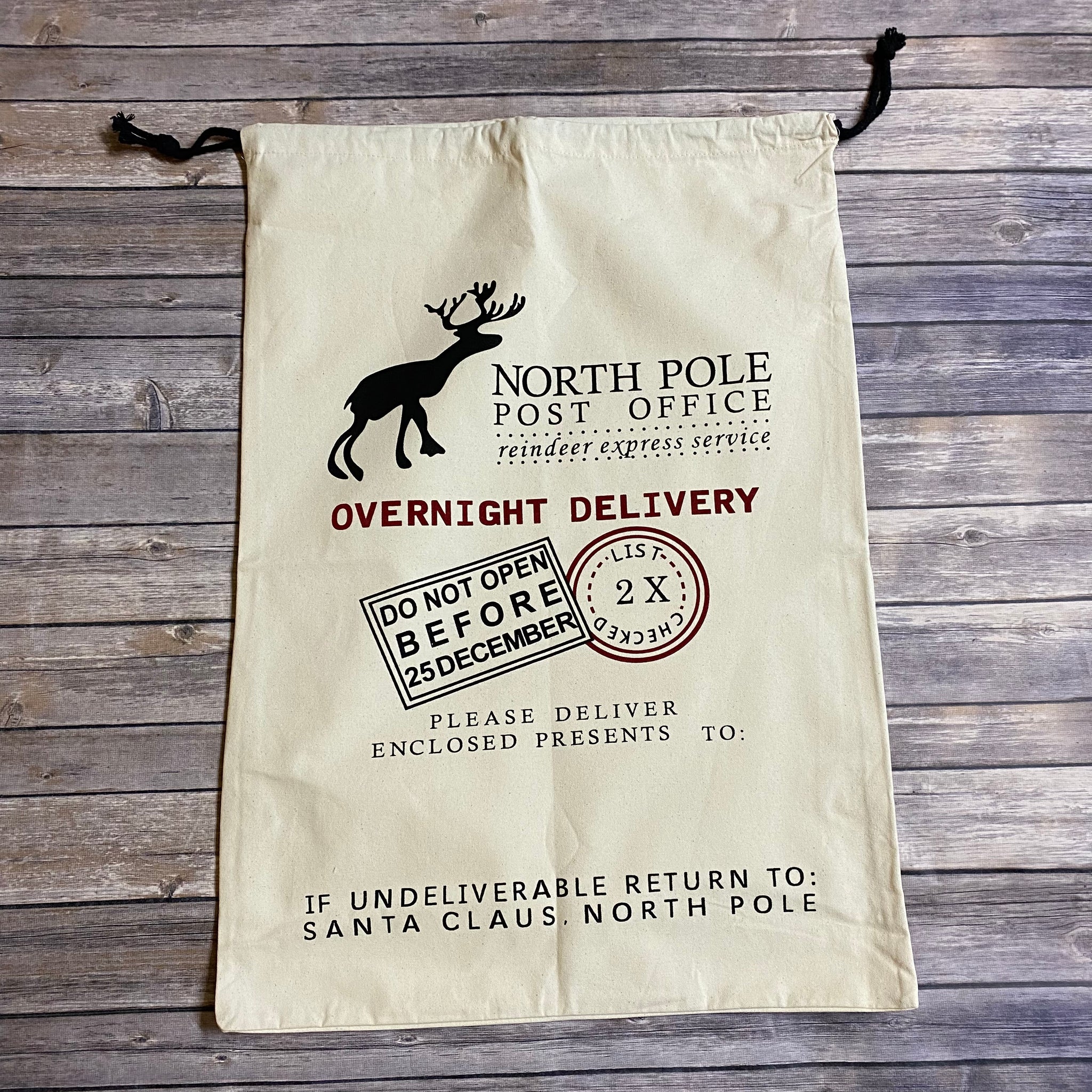 These Santa Sacks are so popular right now! They are the jumbo size and measure 27" x 20" and feature a drawstring closure. This design features a reindeer and vintage look of the North Pole Post Office. The stamp says do not open before 25 December and checked twice. So cute!