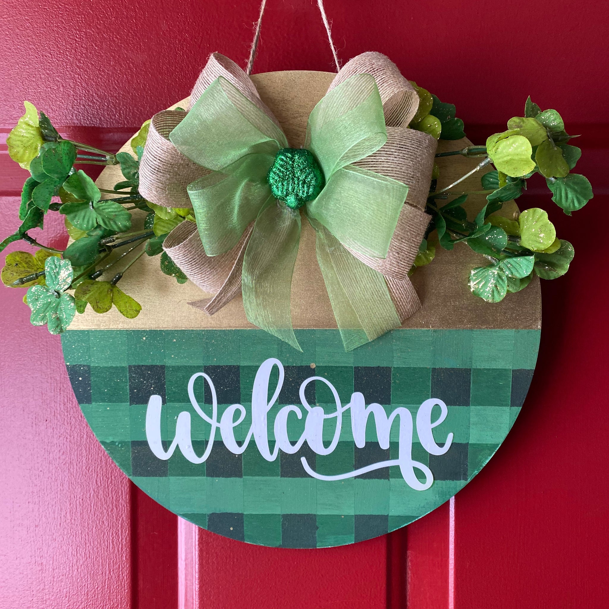 This door hang has been hand painted. The top half is shiny gold and the bottom is hand painted with a green St Patrick's Day plaid on the bottom! There are splatters of gold paint on the bottom from my pesky leprechaun helper. It is accented with green and light green clovers and a two ribbon boy with a sparkly It has the word "Welcome" on it, It measures 14" x 12" and is and is ready to hang.